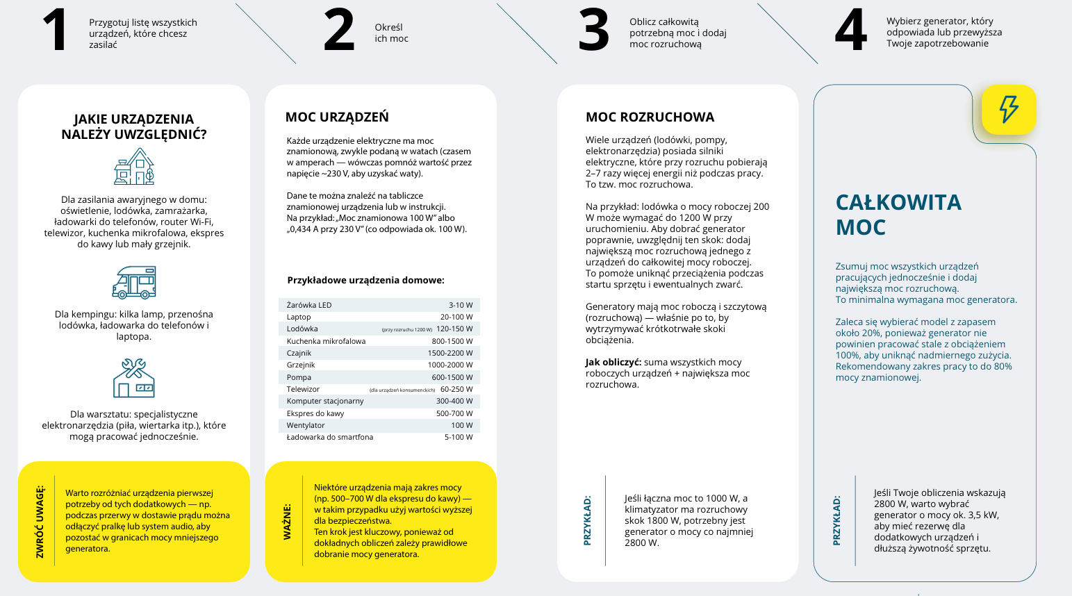 Koszt generatora będzie bezpośrednio zależeć od maksymalnej i znamionowej mocy urządzenia. Dodatkowo trzeba brać pod uwagę reputację marki, dodatkowe funkcje oraz akcesoria. Nie powinniśmy się skupiać tylko na mocy i cenie końcowej. Aby określić moc generatora, najpierw musisz obliczyć, ile energii potrzebujesz, jeśli zdarzy się wypadek lub zanik prąd. wg poniższej grafiki