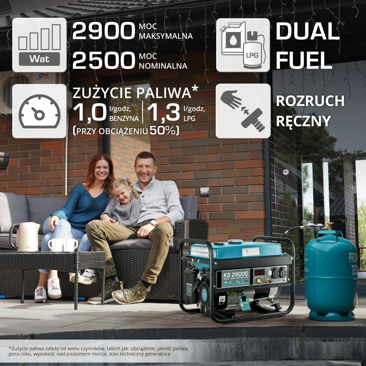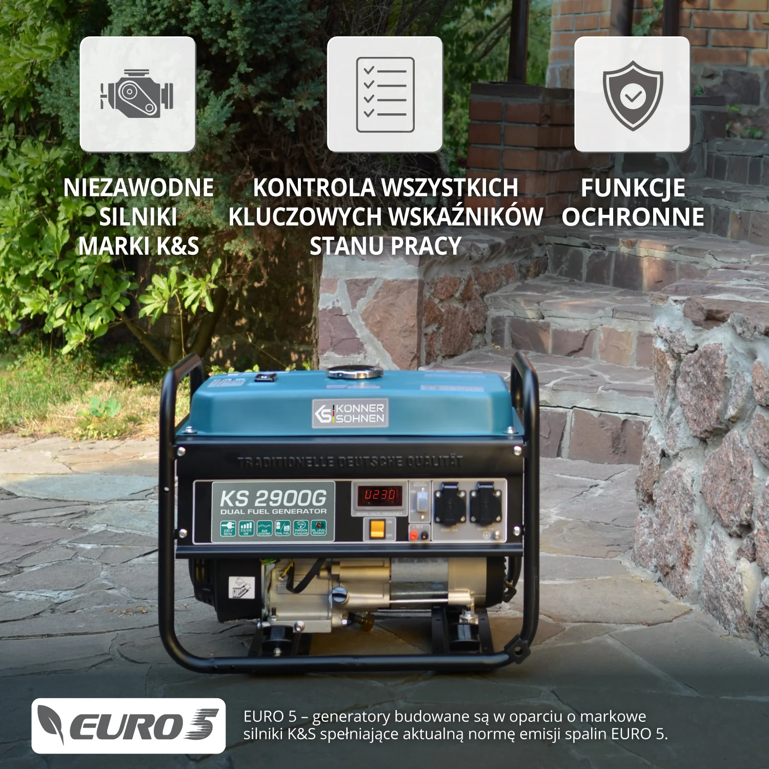 Generatory hybrydowe marki «Könner & Söhnen» serii DUAL FUEL to obecnie najbardziej popularna seria generatorów ze względu na ich oszczędność oraz przyjazność dla środowiska. Generatory tej serii mogą pracować jak na benzynie, tak i na LPG.